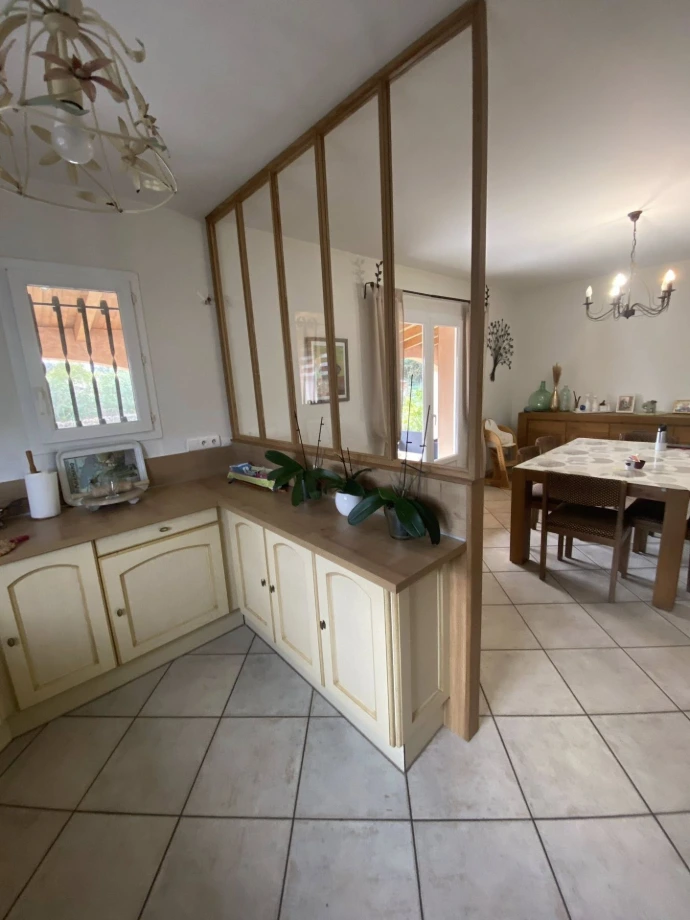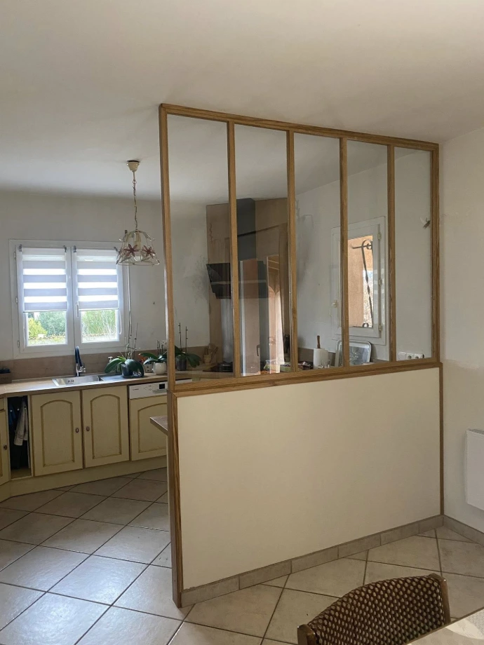Pour structurer l’espace sans le fermer, Olivier a également conçu et réalisé une verrière sur mesure séparant la cuisine de la salle à manger. Réalisée en chêne massif et équipée de verres clairs de 6 mm, cette verrière laisse généreusement circuler la lumière naturelle tout en créant une vraie délimitation visuelle entre les deux espaces. Son dessin épuré et ses montants en bois massif apportent une touche élégante et authentique à l’ensemble.